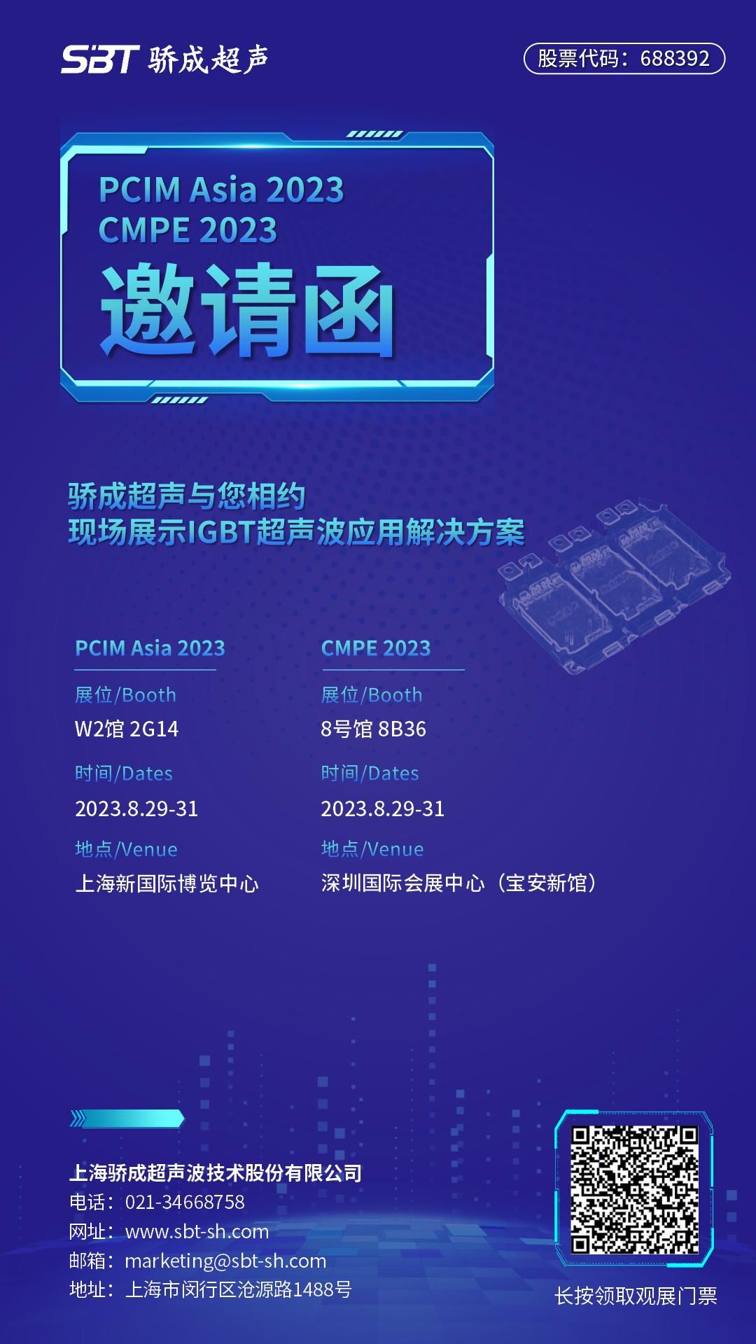 8月29-31日,上海国际电力元件、可再生能源管理展览会(PCIM Asia 2023)与第五届精密陶瓷暨IGBT产业链展览会(CMPE 2023)将分别在上海新国际博览中心、深圳国际会展中心举办。届时,骄成超声将携功率半导体超声波应用解决方案分别亮相,分享行业洞察与热点产品,欢迎各界新老朋友莅临骄成超声展位参观指导!